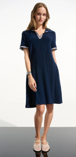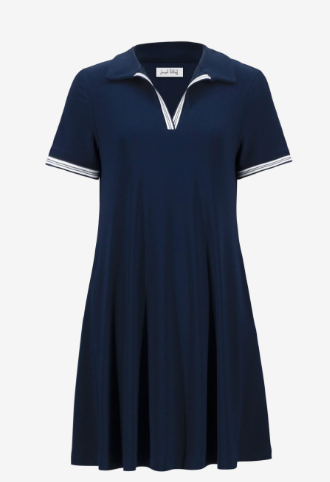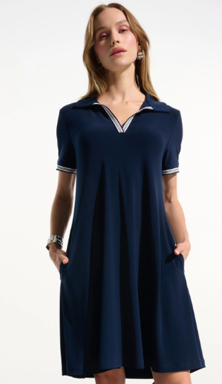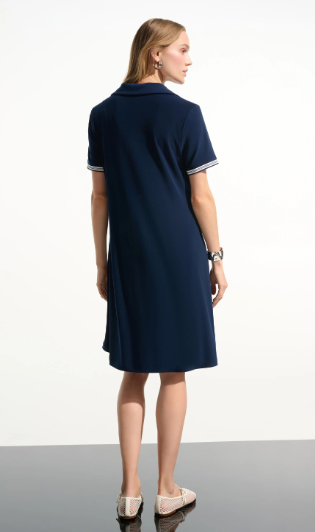 Questo abito a trapezio in maglia effetto seta è un perfetto mix di raffinatezza e comfort, con il suo colletto polo a costine e le maniche corte. Le tasche interne mantengono la praticità.