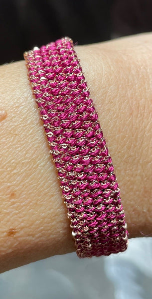 Bracciale lavorato a mano a telaio, intreccio seta ciliegia ed argento placcato rosè. Estremamente raffinato e particolare. Lunghezza 15+2 cm, altezza 1 cm.