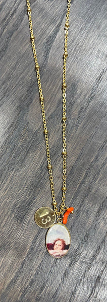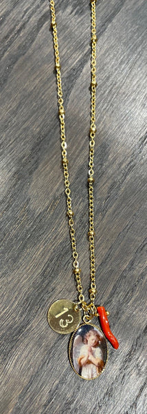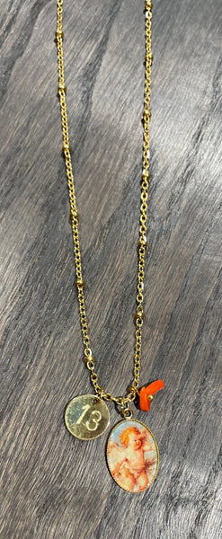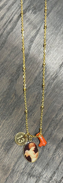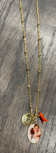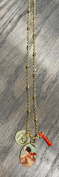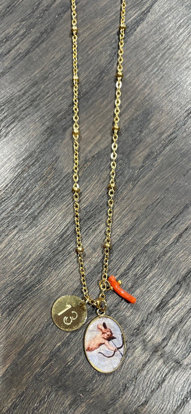 Collezione "Santini" in stile Vittoriano, pezzi unici fatti a mano. Tutti i bijoux MrBiggy sono realizzati a mano, in ottone placcato oro, conformi alle normative CEE. Lunghezza 50 cm.