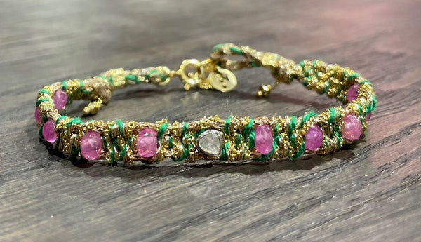 Bracciale in argento placcato oro, lavorato a mano a telaio, Diamond, Zaffiro rosa. Estremamente raffinato e particolare. Lunghezza 15+2 cm.