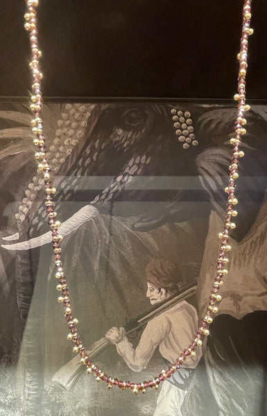 Questa collana fa parte di un progetto artistico in cui la stilista affianca da sempre l'impegno sociale che prevede l'inserimento nel laboratorio di donne indiane senza occupazione e la loro formazione specialistica per un migliore inserimento nella società. Manufatto realizzato in leghe metalliche  smaltate intrecciate con fili di cotone. Lunghezza 120 cm