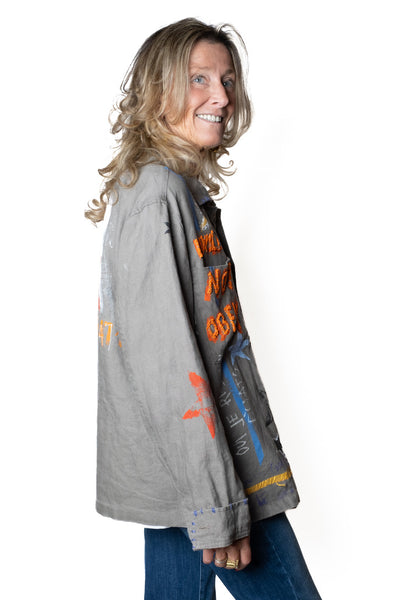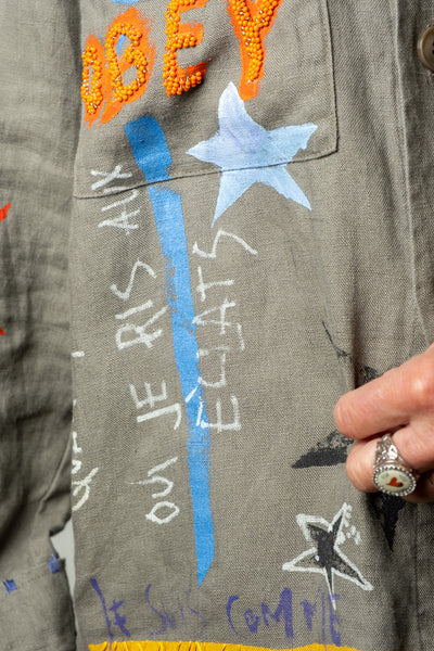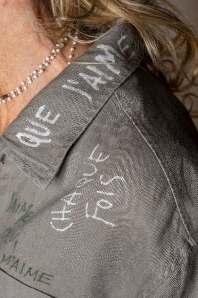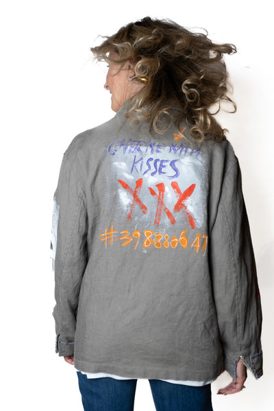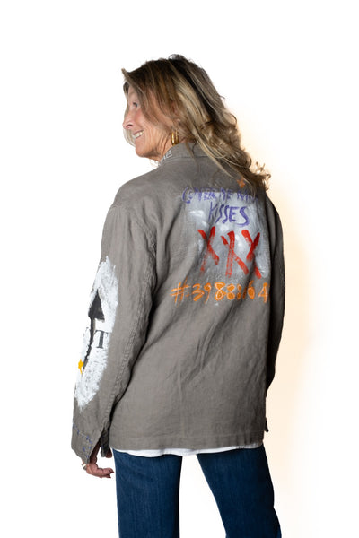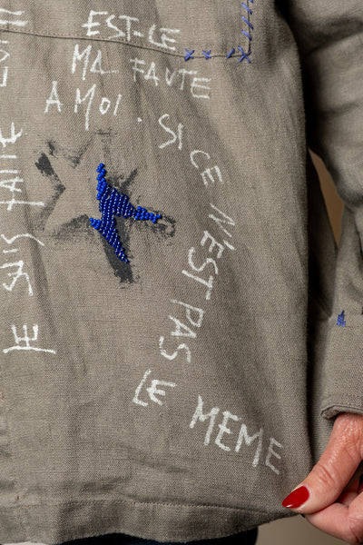 Giacca 100% lino, dipinta a mano, ispirata alle poesie di Prévert, ricamata a filo e perline, pezzo unico.