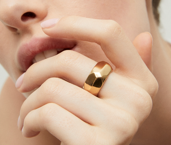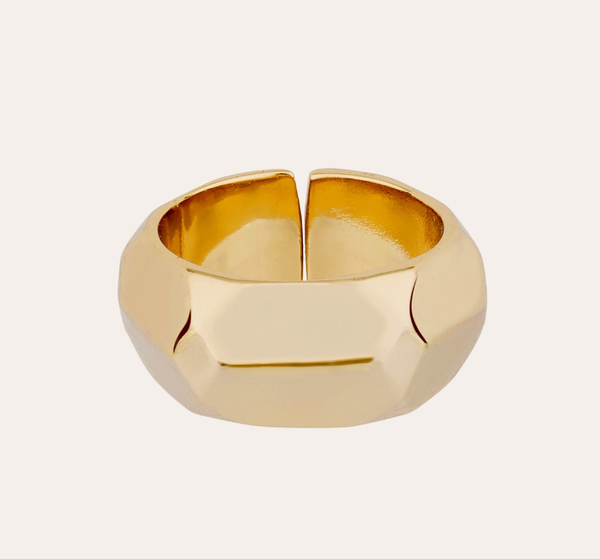 Anello placcato in oro, realizzato a mano. Il suo design geometrico si ispira alle sfaccettature delle pietre preziose, creando un gioco di luci sottile e raffinato. Un gioiello scultoreo, puro e intramontabile, da indossare da solo o abbinato ad altri. Regolabile.