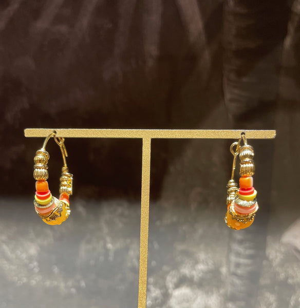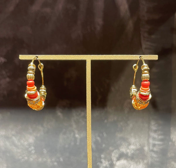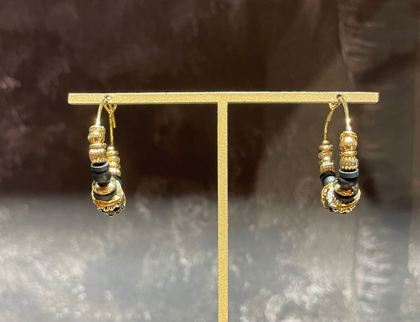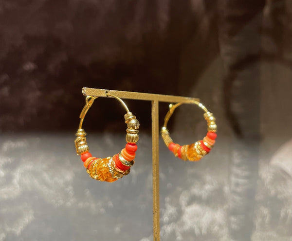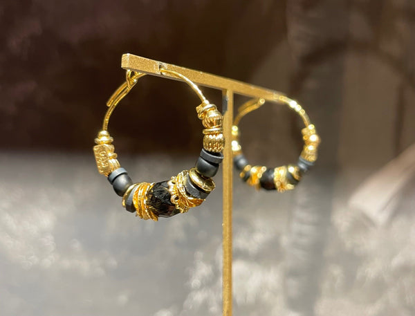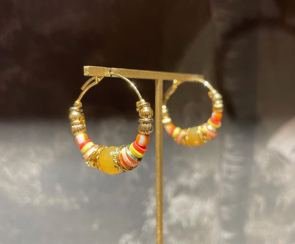 Orecchini a cerchio placcati in oro decorati con perline, anelli dorati. Gli elementi sono assemblati a mano.Diametro: 3 cm.
